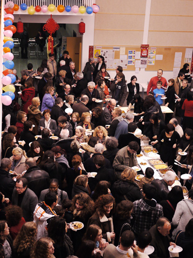 到场的来宾人数达到了三百之多。他们一进大厅便被布置的相当有中国特色的新年气息的氛围所感染。最先开始,是普瓦提埃大学孔子学院理事长Alain Mignot 的致辞。他热情洋溢地感谢大家对中文教学的发展做出的贡献和帮助,请来宾们一同品尝中国的特色饮食以及参加各类特色游戏。在长长地精心布置地餐桌上摆放着春卷、包子、蛋炒饭、青椒炒牛肉等中国食品。孔院工作人员热情地为每位来宾服务。准备的游戏有夹乒乓球、运乒乓球和贴鼻子。来宾都对这些富有趣味性的活动表现出极大的热情。他们积极地参加并得到了精心准备的小奖品。