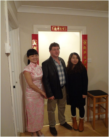 公历2013年2月9号,中国农历年2012年的最后一天,除夕,来自SSAT项目的汉办老师张秀英和汉语志愿者老师于长保在住处的门框上贴上了中国带来的对联, 在门上也贴上了中国特色的福字, 墙上挂上了红红的中国节,将房子打扮一新。因为这一天Bay House School & Six Form 的校长Mr Porter 及各位来自语言部的几位老师将和他们一起包中国饺子,共度中国除夕夜。