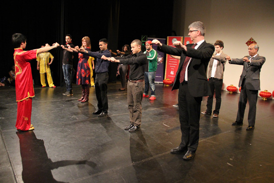 演员们不仅选择呈现中国春节浓浓年味儿的节目,还增加了很多互动的环节。比如:演出中间的武术长拳、蛇拳互动以及转手绢的舞蹈互动中,很多学生积极踊跃的上台,跟我们的武术老师和舞蹈老师学习动作,他们精彩的表演增加了很多欢声笑语,也赢来了观众经久不息的掌声。另外,演出寓教于乐,观众们在现场学会了“你好”、“谢谢”、“很好”、“春节快乐”等简单的汉语,现场欢声笑语不断,气氛热闹非凡。