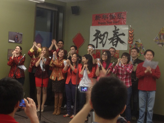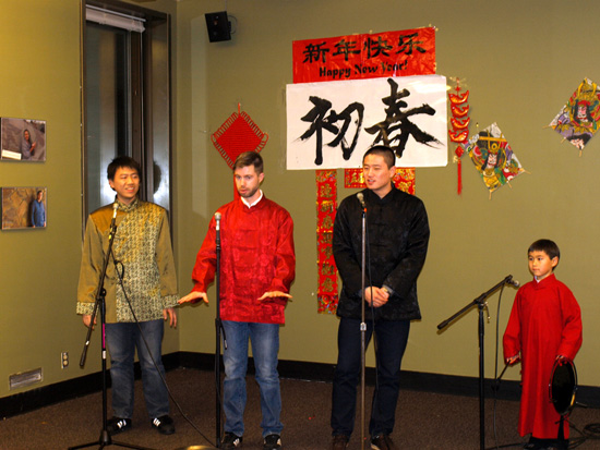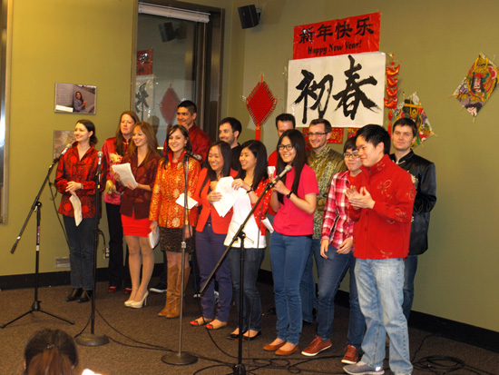 随着俄勒冈地区汉语热的持续升温,中华民族的年俗文化也逐渐深入到本土地区的汉语课堂教学中。2013年2月9日,正值中国农历除夕,由波特兰州立大学孔子学院与国际管理研究生院联合举办的新春联欢会在波州大史密斯学生中心228室里热闹开场。大红的灯笼、喜庆的中国结、金色的“福”字和吉祥的对联使得整个会场都洋溢着欢快浓厚的节日气氛。波州大国际管理研究生院的学生们也都身着节日盛装,师生一起欢度中国农历的蛇年春节。