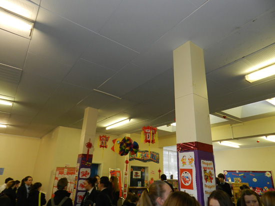 2013年2月4日开始,作为主会场的校图书馆被陆续换上了中国年新装:挂灯笼,贴年画,挂喜庆鱼,生肖故事展示等。每一位走进图书馆的师生立刻觉察到了中国新年的到来。一些师生还对喜庆鱼的制作等颇感兴趣,希望有机会在中文俱乐部中尝试制作。