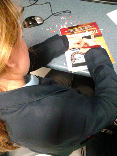 2013年2月5日,校后中国剪纸俱乐部如期举行,学生看着自己亲手剪出的中国蛇型团案,开心极了。