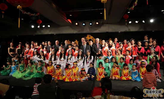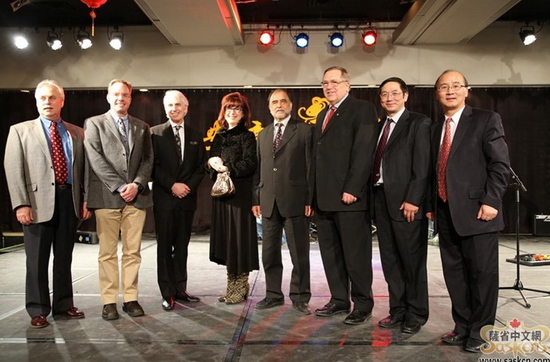 晚会上,萨斯卡通市长Donald J. Atichison先生(图3右三)做了热情洋溢的致辞。市长表示他是当地华人的老朋友,他很高兴参加中国新年的庆祝活动,并对中国人民过去及现在对加拿大的建设与发展所作出的贡献表示由衷的感谢。为了显示他的中文在逐年进步,市长在致辞结束时用中文向大家拜年,祝大家新年快乐!与国际学生接触最密切的萨大留学生中心主任也在致辞中表达了对萨斯卡通华人社区的感谢及祝福!萨大孔子学院的喻佑斌院长代表孔子学院表达了对当地华人的新年问候,并向大家介绍了孔子学院的概况和工作计划(图2 )。