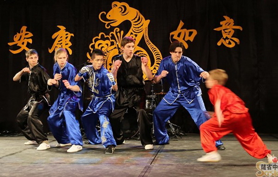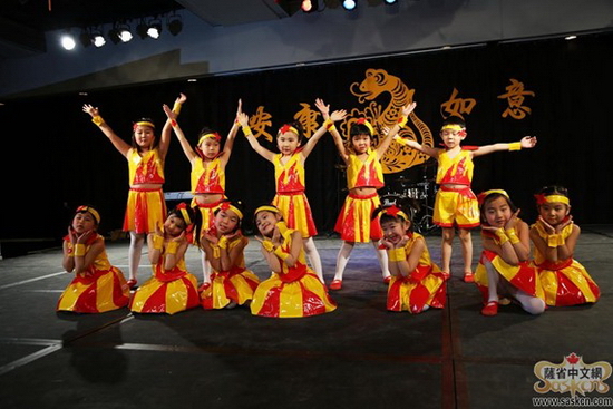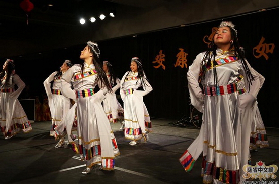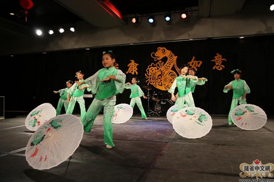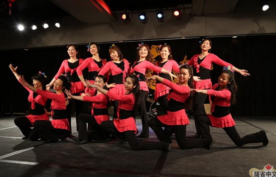 当晚的文艺表演把晚会的气氛推向高潮。小朋友们献上了精彩民族舞蹈(图4),“超级宝贝”(图5)则引来大人们一阵阵掌声;舞蹈“青花瓷”代表了中文学校的舞蹈水准(图6);萨大音乐系教授表演的钢琴、萨克斯风版的梁山伯与祝英台别具韵味(图7);中国武术套路组合赢来了一片喝彩(图8);孔子学院学生表演的拉丁舞-爵士舞组合向大家展示了南美的本土风情(图9);本地中文教师表演的“向快乐看齐”活泼、阳光、健康、大气(图10)。反映了教师们的精神风貌;多才多艺的演员们献上了广场舞、说唱、古筝二胡合奏、男女生独唱等精彩的节目,博得观众阵阵喝彩。压轴的少年组表演的舞蹈“谁不说俺家乡好”让观众席气氛沸腾。小同学们的表演加上他们民族风格的鲜艳服装勾起了华人观众情不自禁的思乡之情。演出结束,现场响起经久不息的掌声。