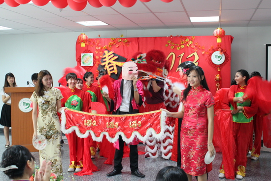 今年的联欢晚会活动气氛欢快、场面盛大。联欢活动在人文学院新落成的4号楼2楼大厅举行。学生们布置了大红的舞台背景,在楼上楼下将大红灯笼高高挂起,整个会场一片喜气融融的中国年味。由大二学生担任的主持人用中文讲述了年的来历,各年级的学生们精心准备了歌舞表演:大一新生们的舞狮首先来了个开门红,学生们将寓意着好彩头的狮子舞得活灵活现,赢得满堂喝彩;大二学生以精湛的演技演绎了小品剧《喜羊羊拜年》;大三的学长学姐们表演的歌舞《咏春》美轮美奂,男生修文的反串,更是掀起阵阵高潮;大四的听成语抢答实实在在的考研了一下大家的汉语听力和判断能力,还有同学们的卡拉OK演唱也深受观众们喜爱。