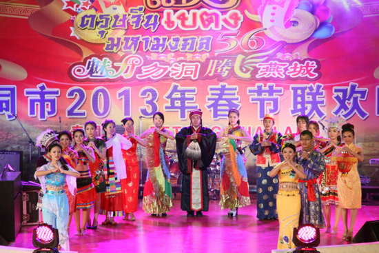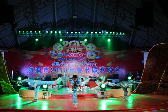 2月10日,由勿洞市孔子学院与勿洞市政局联合主办的“勿洞市2013年春节联欢晚会”在万众期待中热烈唱响。也拉府府尹Mr. Detrat Simsiri、也拉府众议院议员Mr. Prasert Pongsuwansiri、也拉府行政管理委员会副主席Mr. Ubdularyee Samang、陶公府旅游管理办公室助理署长Mr. Musa Yahkoh、勿洞县县长Mr.Supawarit Petka、勿洞市拿督Khunawut Mongkhonprajak(陈进森)博士、勿洞市市长Somyod Lertlamyong (容志江)、勿洞市侨团总领袖洪树丰、勿洞各界领导、各国嘉宾与游客及勿洞市民约20000人欢聚于此,共享盛宴。勿洞市电视台进行现场直播,30%以上的观众在家收看了晚会。