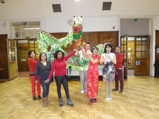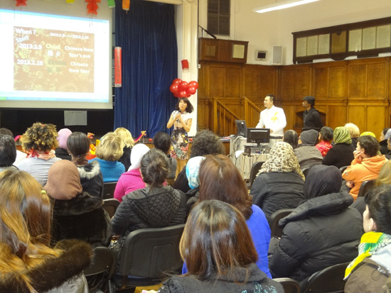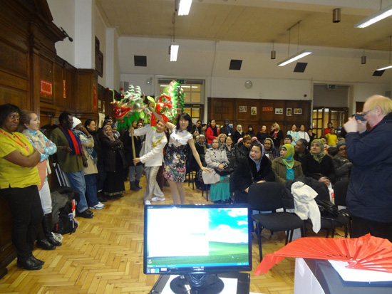 2013年2月12日,英国伦敦Working Men’s College (WMC)迎新春系列活动在该校礼堂拉开了序幕。来自伦敦中医孔子学院的三位教师受邀在该校礼堂进行了一场别开生面的中国春节互动讲演。伦敦中医孔子学院下属博柯立中学孔子课堂林蔓春老师通过各种生动活泼的互动和展示,巧妙地把新年祝语、十二生肖、春联、压岁钱、春节美食、元宵节等春节元素和中国年俗介绍给到场观众。在生动有趣的新年介绍之后,三位老师带领着英国观众,通过现场舞龙把整个会场气氛推向高潮,同时把中华民族的美好祝愿带给英国朋友。