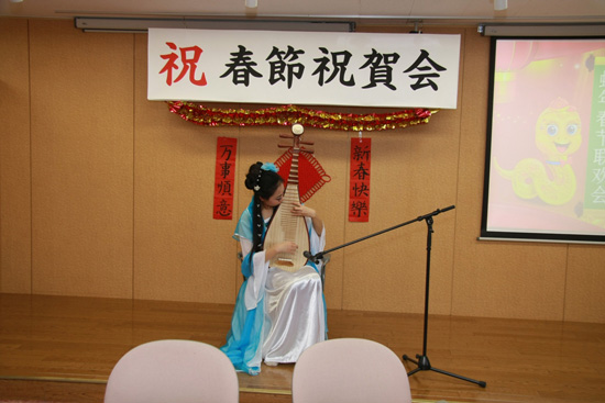 随后,孔院的学员们表演了中文歌曲,电影情景竞猜等节目。大阪产业大学的中国留学生也带来了中国民族舞蹈表演和传统民乐演奏。期间还穿插了日式的BINGO游戏、猜拳游戏、中国文化知识辨识游戏等等。游戏的获胜者都得到了孔院精心准备的福袋等奖品。最后,日方院长和副院长分别表演了中文歌曲和中国剑术,将春节祭推向了高潮。