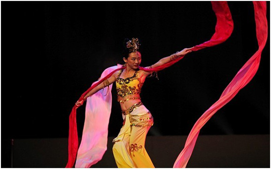 新东方艺术学校舞蹈演员陈思的独舞《飞天》。舞者用肢体配合音乐演绎出敦煌壁画中的飞天形象,配合着舞台变幻莫测的灯光色彩,给观众献上一场视觉盛宴。