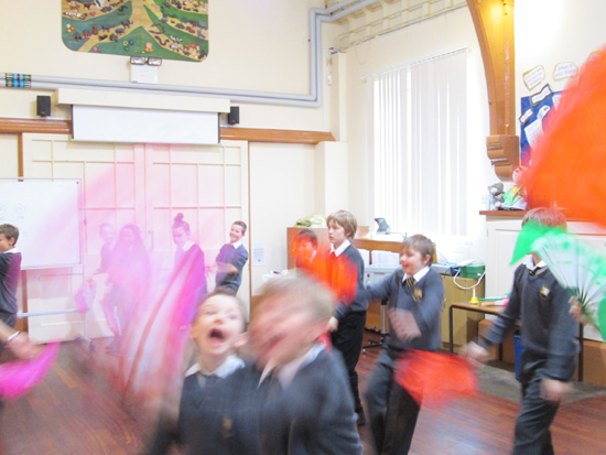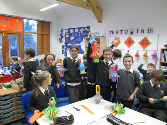 在Saigton Church of England Primary School, 33名5、6年级的学生与汉办老师一起跳起了欢快的扇子舞。孩子们跟随着欢快的音乐,兴奋地舞动着美丽的中国扇,不时地向老师和同伴展示他们的独创的扇子舞造型,整个活动大厅洋溢着欢乐的气氛。回到教室,孩子们跟随汉办老师一起制作了五彩灯笼,色彩缤纷的灯笼给学校增添了中国年的喜庆气氛。