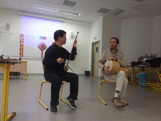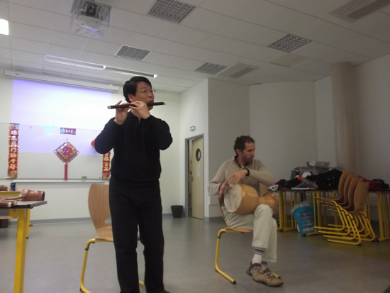 张金桐院长即兴发挥,凭着从中国带来的各式乐器,奏出一首首曼妙的乐曲,给全场师生带来了一场听觉盛宴。赢得了阵阵掌声。接着张院长又与法国朋友一道合奏了几首经典名曲,最后以一首他改编的法国名曲结束,把庆祝会现场带入高潮。之后一年级学生和几位中国老师合唱的中法式《两只老虎》充分体现了艺术之美以及动与静的完美结合。你方唱罢我登场,声乐表演之后,即是在高山流水乐曲相衬下的茶艺表演。表演者以一种柔美和谐的方式把茶道呈现给了法国朋友。庆祝会以柔而不失刚强的蒙古舞蹈结束,力与美的相合带来的是无尽的回味。