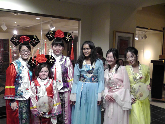 作为第一个展示的节目,双节棍和单刀的表演展示出了中国传统武术的力与美,观看过程中不少观众下意识的都会将自己的身体向后回缩,但又兴奋的将头向前探出。精彩的表演赢得了在场观众阵阵的惊叹和满堂的掌声。随后的中国传统服装秀则将中国古典服饰的端庄、优雅和柔美展现到了极致,表演结束后的互动现场,许多观众迫不及待地将展示的服装和头饰套在自己身上,来体验一下中国古代传统服饰的美。镜头纪录下的张张笑脸显示出了他们内心的兴奋和喜爱。三个金发碧眼的美国学生情不自禁地向孔院的老师们询问,都想买一套我们展示的服装,但得知这些衣服都是从中国买来的,并且可能只有纽约才能买得到之后,她们都流露出一丝失望的神情。