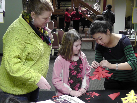 沿着博物馆的走廊继续往里走,只见孔子学院的四、五位老师们正坐在大圆桌旁教孩子们剪纸、折纸、学扎中国结。圆桌上摆放着五颜六色的彩纸、剪刀以及颜色、尺寸各异的绳结。不一会儿,眼看着一个个活灵活现的蜻蜓、青蛙、金鱼出现在中国老师的剪刀之下,孩子们惊讶地张大了嘴巴,瞪圆了眼睛,“哇”,真神奇呀!孩子们看着看着,个个磨拳擦掌,跃跃欲试。几个十多岁的孩子率先主动要求试一试,几个小一点的孩子也不甘落后。在孔院老师的帮助下,孩子们很快剪出了立体状的“春”字,有的也学会了用彩绳扎出简单的中国结和手链。看着孩子们最后带着自己努力作出的各种艺术作品,孔院的老师们都非常兴奋,一直说:“你真棒”。孩子们对孔院的老师们回以灿烂的笑容,并尝试用中文说:“谢谢” 和 “再见”。