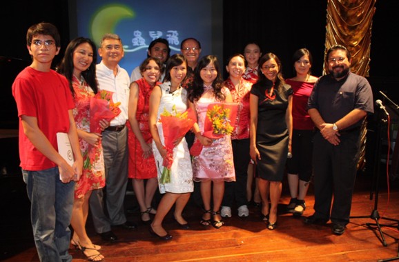 吴院长及埃察沙雷塔处长共同为12名优秀学生及83名毕业生颁发奖状及学业证书,并合影留念。尤大孔院的学期汇报演出意义非同一般,一方面检验了学生对所学的汉语知识的应用和掌握程度,另一方面通过这些精彩的节目演出,不仅使学生更深了对中国的文化了解,同时也是面向墨西哥当地市民的一次效果非常好的中国文化推广活动。不仅学生们开心满足,到场助兴的学生家人及朋友的脸上也都对中国文化表现出了极大的兴趣。表演完毕后,大家都积极踊跃地和孔院的汉语教师合影留念。最后,学生们上台向教师献花并一齐用中文合唱歌曲《虫儿飞》。孔院的结业典礼歌声中完美落幕。 (撰稿人:吴小燕)