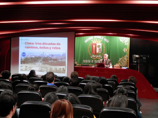 2月6日,上海外国语大学西方语系主任陆经生教授应孔子学院之邀在西班牙马德里自治大学(UAM)哲学与文学院作了专题讲座,题为:中国:三十年的变化、成功与挑战。马德里孔子学院外方院长伊莎贝尔女士、中方院长陈芷女士以及马德里自治大学哲学与文学院长安东尼奥先生共同出席了讲座。受邀前来的还有各个高校研究亚洲、中国的专家学者、各国学生,以及对中国文化感兴趣的社会人士。可容纳150人的大礼堂座无虚席。
