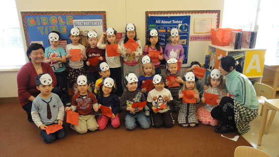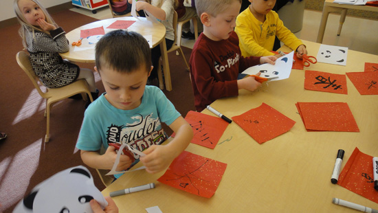 节日期间,普渡孔院还应普渡幼儿园的老师邀请,为那儿的孩子们介绍春节,并教幼儿们手剪熊猫头戴,用毛笔写上春天的祝福。