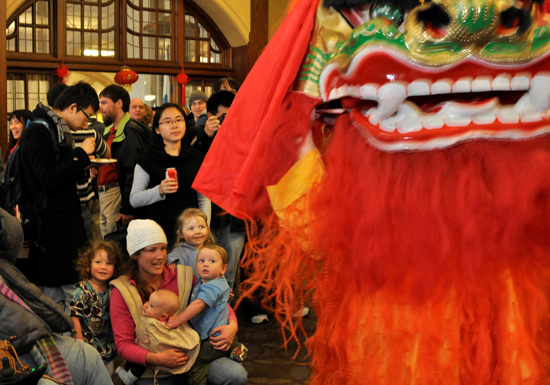 一位美国妈妈带着四个可爱的孩子,前来观看舞狮表演。