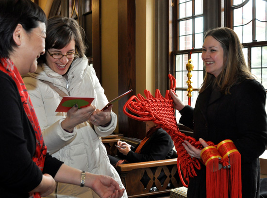 普渡大学孔子学院院长洪玮教授向来宾赠送蛇年贺卡和中国结