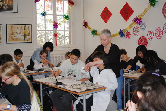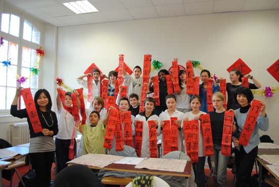 2013年2月15日上午,雷恩市左拉中学的16名学生来到法国布列塔尼孔子学院,和邵游老师一起书写了一副精美的春联,表达了自己的新年愿望。