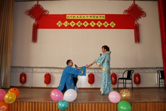 春节是中华民族最隆重最盛大的传统节日。为了庆祝中国的蛇年春节,吉尔吉斯国立民族大学孔子学院各教学点自2013年2月5日起,相继掀起了“中国之美展异域,龙蛇齐舞庆新春”的春节联欢热潮。在辞旧迎新之际,吉尔吉斯国立民族大学孔子学院中方院长马磊、吉方院长KULTAEVA UMUT、孔子学院汉语教师及志愿者们应邀观看了6场演出。