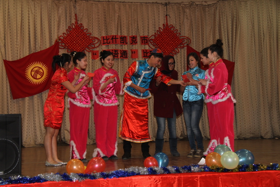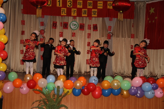 金蛇舞新春,汉语庆佳节。2013年2月5日,吉尔吉斯国立民族大学孔子学院附属孔子课堂——比什凯克市第69中学首先拉开了序幕。当日,比什凯克市69中学张灯结彩,喜气洋洋,处处洋溢着祥和的节日气氛。由该校师生精心准备的春节联欢会华丽上演。腰鼓阵阵,灯笼闪闪,礼堂里人才济济,舞台上春意盎然。藏族舞蹈《天路》、扇子舞《青花瓷》、灯笼舞《好中国》,以其优美的舞姿、动人的旋律赢得了在场观众的热烈掌声。六年级小朋友带来的汉语脱口秀表演,以字正腔圆的发音和幽默的话语,燃起了观众们新年的希望。