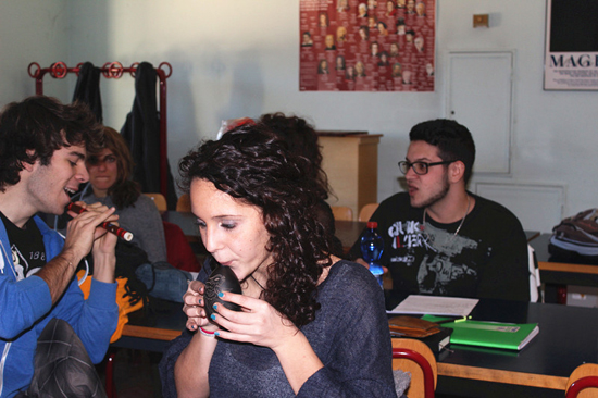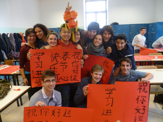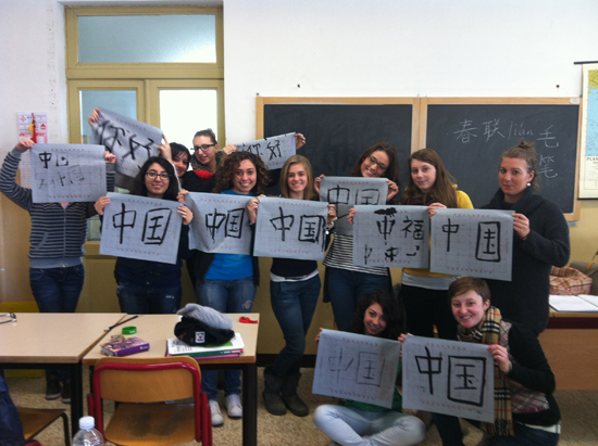 两天后,Ivrea高中教学点也迎来了同样热闹的庆祝场面:众多班级的学生和中国老师一起吹气球、贴春联、挂中国结、插中国国旗,装扮过后的教室充满浓浓的节日气息。之后,学生们用毛笔写下深深的祝福,并合唱中文歌曲《新年好》以及《幸福拍手歌》,把自己的新年愿望以及对中国的热爱表达在书法里,融入到歌声中。
