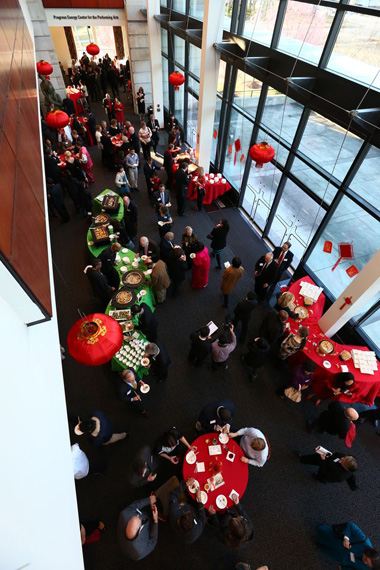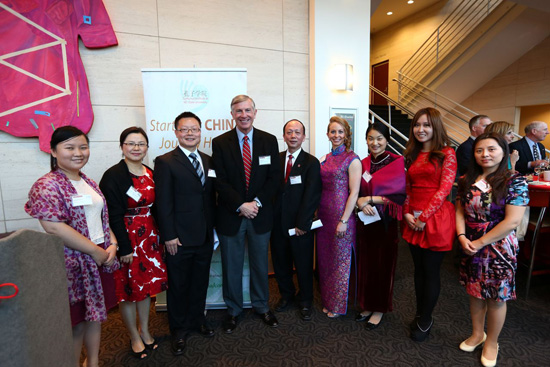 蛇年新春招待会则把这一系列贺新春活动推向了高潮。来自北卡政界、教育界和商界的贵宾,欢聚一堂,与北卡州大孔子学院的工作人员,共同回顾孔院六年的发展,祝愿孔院有更加美好的未来。应邀参加招待会的有北卡共和党参议员Harris Blake先生、民主党众议员Joe Sam Queen先生、北卡罗莱纳大学总校校长Tom Ross先生、橙郡教育局总学监Patrick Rhodes先生、中卡社区大学校长Bud Merchant博士、北卡科技三角园区著名企业的CEO、北卡当地华人社团的领导,以及北卡州大校级和院系的负责人等300多位来宾。