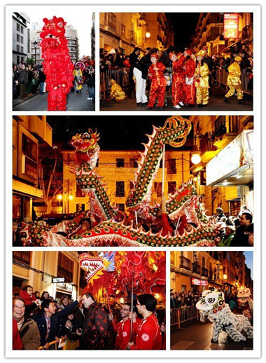 2012年2月9日晚上6点30分,中国农历除夕晚上,为庆祝蛇年春节,孔子学院在瓦伦西亚市中心唐人街举行了中国民俗文化街头表演活动。 舞龙舞狮的表演者都是地地道道的西班牙人,他们欢快、流畅而又专业的表演赢得了现场观众的一阵阵喝彩与掌声。现场还同时表演了太极拳与中国功夫,表演者也多是西班牙人或当地华人。整个街头民俗文化表演活动持续了将近2个小时,吸引了数万民众驻足观看。同往年一样,今年的街头民俗文化表演活动也得到了瓦伦西亚市政府的批准与支持,并专门派出了维持秩序与治安的警察。为了方便民众观赏民俗文化表演活动,孔子学院还组织了几十名志愿者协助警察维护现场秩序,孔子学院的工作人员还向现场观众派发了各种宣传品。此项活动吸引了当地多家主流媒体的关注报道,孔子学院院长安文龙还接受了多家媒体的现场采访。街头民俗文化表演之后,200多名中西友人在荣华饭店一边欣赏中国中央电视台蛇年春节晚会,一边享用中国传统春节美食。随后进行的抽奖活动把新春晚会推向了另一个高潮,有一些幸运者获得了汉语学习奖学金和中文书籍。