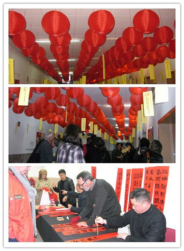 其中,受孔子学院邀请前来的主讲人当地华人书法艺术家刘丹老师举行了以《辞旧迎新——春节的传统习俗》为主题的讲座。讲座介绍了中国农历新年的习俗,从腊月二十三小年开始,中国人就进入了一系列新年活动,而腊月二十四的活动——写春联和贴春联则尤为重要。为了让大家更好地亲身体验,刘老师以及两位当地书法爱好者还当场表演了写春联,指画等技艺。而猜灯谜的互动活动更掀起了本场的高潮,会场内挂满了富有中国特色的灯谜灯笼,一时间人头攒动,人人都踊跃猜谜,大家对中国这一传统文化活动表现出了浓厚的兴趣。