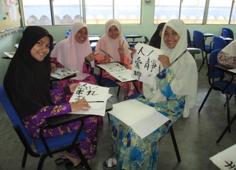 下午,教室里的阵阵墨香吸引学生们陆续入场。老师将准备好的视频演示播放给学生并进行讲解,学生们根据多媒体图像说明和老师手把手的教练,一个个漂亮的汉字跃然纸上。从笔画简单的“人”字,到笔画复杂的繁体的“夀”,学生都能逐渐地一笔一划,准确无误地写出来。结合中国新年,学生们的书法作品中处处可见“吉祥如意”等对中国新年的祝福。一些曾经多少见识过中国书画的学生,更是发挥其创造性,在他们的笔下, 方块儿汉字变成了阿拉伯文字, 中国画中的梅兰竹菊也变成了马来西亚的椰子树和马来西亚大红花。有些学生还画出了可爱的蛇形图案,中、马书画交相辉映,别有一番意趣。出人意料地体现了两国文化之间的沟通和融合。 也体现了学生们对中国传统文化艺术的理解和认同。根据学生们的不俗表现, 孔院老师们不失时机地当场评选出不同种类作品优秀奖,更使得学生们兴趣倍增。
