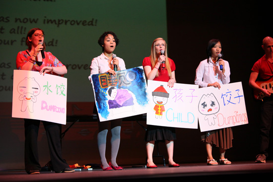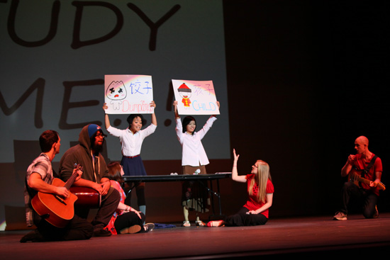 中阿肯色大学中文辅修专业的学生用中文自编自演的滑稽短剧赢得了观众的阵阵笑声