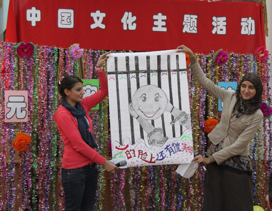 整个主题文化活动由孔子学院中方院长高富锋主持。活动一开始先由李仁安教授介绍了元宵节这一传统节日的由来及习俗。接下来孔子学院教师周芳萍等演唱了中国歌曲,尤其是江薇等老师的戏曲联唱,其中《女状元》和《贵妃醉酒》选段博得了阵阵喝彩。中国老师表演之后是猜字谜, 当“一加一(王)”等字谜显示在大屏幕上时,所有的同学都非常踊跃,抢着举手……苏伊士运河大学中国事务中心主任阿里.扎略特教授还在中国教师的帮助下猜出了“刘邦听了笑,刘备听了哭(翠)”这个字谜,博得了大家的热烈掌声。在每一个字谜答案揭晓之后,李仁安老师还现场将谜面讲解了一遍,未猜中的同学恍然大悟,学员们都纷纷表示,汉字真的很奇妙,他们要好好用功学习,掌握更多的文化知识。