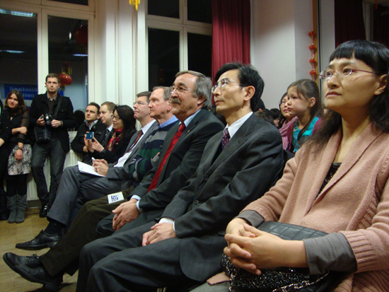 “悠悠中国风,浓浓中国情”使热情的观众沉浸在一片欢乐中,也激起杜伊斯堡市市长曼弗雷德•奥森格先生(Manfred Osenger)的演讲激情,他在新春致辞中说,他非常感谢在杜伊斯堡-埃森大学学习的两千多中国学生、学者以及华人华侨,是他们给杜伊斯堡带来了古老的中华文化,要借此机会向大家致以中国蛇年春节的新春祝福。市长先生回顾了1982年以来杜伊斯堡作为第一座与中国建立友好城市关系的德国城市,30年来与友好城市武汉的关系日益密切,特别是2009年杜伊斯堡—埃森大学和武汉大学合作建立的鲁尔都市孔子学院将双边的交流和合作水平推向了一个新的高度。他高度赞扬孔子学院三年多来所作的不懈努力和所取得的丰硕成果。三年来,市政府为鲁尔都市孔子学院提供了办公场所,并承诺将继续对孔子学院给予更强有力的支持,以促进德中双方未来的合作与交流。