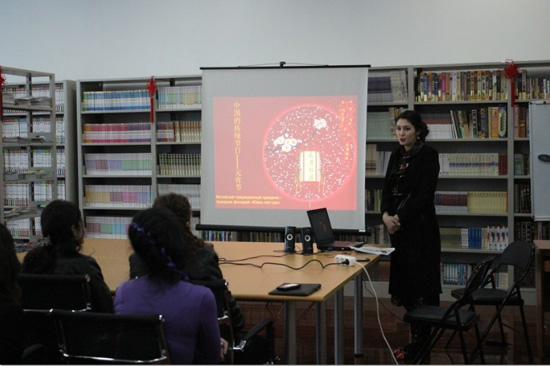2013年2月25日,塔吉克斯坦国立民族大学孔子学院在塔吉克斯坦国家图书馆中国厅举办文化讲座,向塔吉克读者介绍元宵节这一中国传统佳节。
