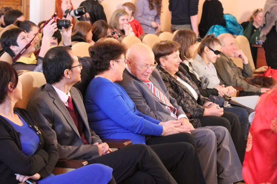 晚会最后,韩丹星院长带领现场观众倾情演唱一曲俄罗斯老幼皆知《让生活充满阳光》的歌曲,全场观众全体起立合着拍子、噙着热泪高歌着:让我们生活的世界每一天都充满阳光、、、、、 。 晚会在激动人心、热情洋溢的气氛中落下帷幕。