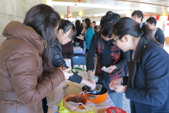 演出结束后,为了向葡萄牙朋友展示中国传统文化,米尼奥大学孔子学院还精心设计了一个小型的庙会,以传统摊位的创意设计出汤圆摊、茶叶蛋摊、南方炒粉档、狗不理包子档、茶水档等等,现场制作可口的传统食品,让来宾在了解中国传统文化之余,更能亲身参与制作过程,感受传统节日的喜庆气氛。一旁的手工作坊更有葡萄牙学生现场表演编织中国结,在她灵巧的双手下,一个个精致漂亮、色彩鲜艳的传统手工艺品呈现在观众面前。