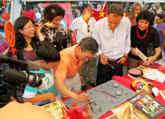 拉普拉塔市市长巴布罗.布鲁埃拉(Pablo Bruera)、中国驻阿根廷大使馆文化参赞韩孟堂先生、拉普拉塔市市政厅主任Santiago Martorelli、市政府外事顾问Rafael Velázquez等出席了庆祝活动。 图为布鲁埃拉市长兴致盎然地在孔子学院的文化展台前向韩孟堂参赞学写“福”字,并与韩参赞、孔子学院和希望武术的部分人员合影。