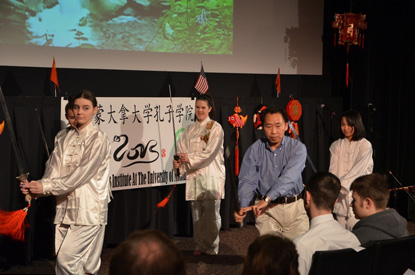 接下来,小演员们头戴满族的头饰,为大家带来了舞蹈《紫禁城的暮光》。尽管舞姿尚显稚嫩,但小演员们一个个都跳得非常认真投入,给晚会增色不少。柔美的舞蹈之后,几个身着白衣,手拿宝剑的女子走上了舞台。咦?这是要做什么呀?原来是孔子学院中方院长倪清泉教授要和他的爱徒们表演太极剑了!大家都屏住呼吸静静地期待着。随着音乐的响起,倪院长和学生们一个漂亮的起势,一下子就吸引住了观众。只见他们师生配合默契,姿态优美,剑光凛凛,俨然一派武林高手的风范,大家都看入了迷。表演结束后,大家不约而同地爆发出热烈的掌声。