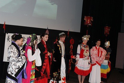 第一个上场的节目是时装秀。来自Hellgate高中的学生分别穿上民族服饰,配上悠扬的民族乐曲,向观众展示了中国传统服饰的魅力,赢得了阵阵掌声。其中一个女生穿的是苗族服饰,满头及身上的银器,一动就发出叮叮当当的声音,她觉得有趣极了,特意又穿着这件衣服独唱了一首民族歌曲《山歌好比春江水》。歌声清丽婉转,唱词字正腔圆,观众们都惊叹着说,才学习一年多的汉语就能达到如此水平,实在不简单哪!