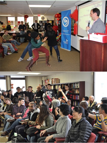 还不到两点,现场已经挤满了前来参加欢庆会的中外学生、当地华侨、民众等一百余人。图书馆内喜气洋洋,笑容洋溢在每个人的脸上,大家互道着节日的问候。前来参加新春及元宵节欢庆会的外国学生多为目前在佐治亚州立大学外语系选修中文专业的学生,他们对中国文化及语言有着浓厚的兴趣,而中国学生多为目前在GSU学习的在校大学生。中外学生共同参与、同堂联欢,外国学生近距离接触到中国的留学生,一系列中国文化知识竞答活动和富有中国节庆特色的游戏活动,给美国大学生提供了一次全方位体验中国传统文化的跨文化交流机会。