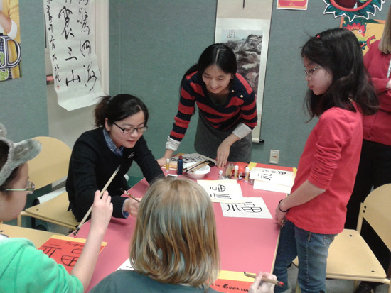 汉语老师教学生写毛笔字