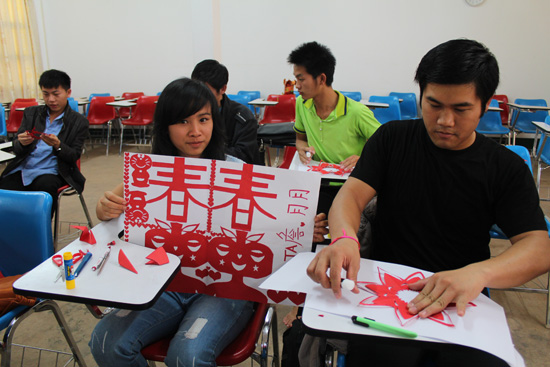 中国结和剪纸课上,同学们在老师的指导下动手做出了精美的团花、精致的小手链,都十分高兴。合唱课上,同学们演唱的《茉莉花》、《半个月亮爬上来》等别具中国风味的传统民歌宛转悠扬。舞蹈课上,一曲《大地飞歌》跳得热情澎湃。同学们积极性非常高,孔子学院也将在合唱及舞蹈班学员里选拔比较优秀的学员加入到孔子学院艺术团中,在将来孔子学院的文艺活动里上台展示自己的风采。