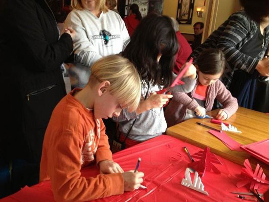 在晚餐之余,布大的另一位中国留学生陆宽在给大家分发“春”字模板,“一分钟学会中国剪纸”,也吸引了很多参与者。孩子们围着桌子工作一小会,一个立体的春字赫然树立,孩子们都欢快地向朋友们炫耀,还不断有孩子提出来希望能带春字模板回家。“当然,你可以带回家,你可以做很多春字中国剪纸给你的朋友们做礼物!”