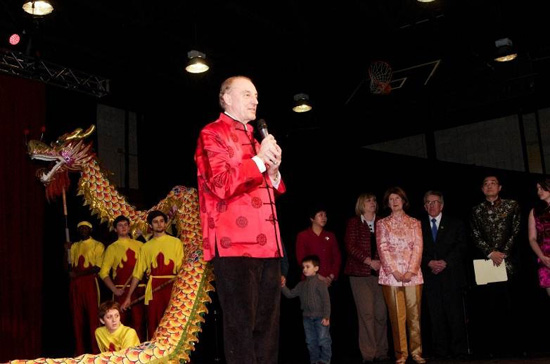 在金龙的引领下,出席嘉宾上台。布莱恩特大学副校长、孔子学院院长杨洪教授首先向现场的观众祝贺新春,并分享了布莱恩特大学建校150周年和布大中国项目运行15周年的喜讯。热爱中国文化并学习两年半中文的Kati Machtley校长夫人用标准的汉语为所有观众送上蛇年的新春祝福:“新年好,恭喜发财!”布大校长、孔子学院理事会主席梅恪礼先生在向现场观众和罗德岛州华人华侨送上新春祝福后,对多来年布莱恩特大学孔子学院在推进中美文化交流和汉语及中国文化在社区的传播所作的工作和努力给予了高度的评价。随后播放的梅恪礼校长在中国地大60周年校庆期间用中文致辞的录像,得到了全场观众的热烈掌声。布大教学副校长José-Marie Griffiths博士,史密斯费尔德市市长Dennis Finlay,和史密斯费尔德市学区学督Robert O’Brien,先后向观众问候新春,祝福来年。O’Brien先生曾两次随布大孔院访华,对中国的发展充满欣喜。在致辞中他欣喜地告诉大家刚满4岁的小外孙已经开始学习中文了。