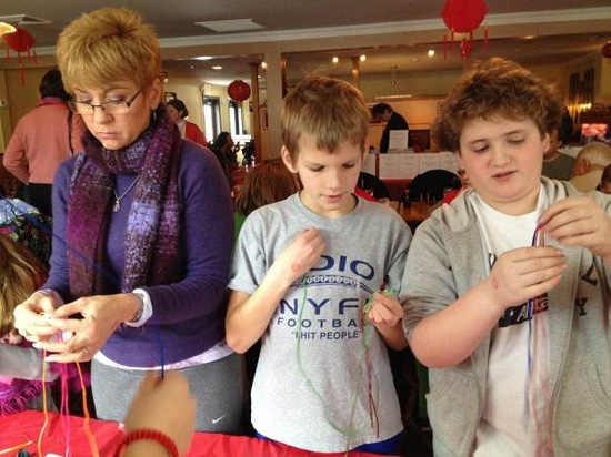中国地质大学(武汉)的余敏老师和学生付佳文演唱了传统民歌,为大家送上了来自中国的新春好运祝福。布莱恩特大学孔子学院汉语教师蒙星宇博士带来了彩色的中国结丝带,现场教“一分钟学会打中国结”,参与者们很快学会之后又兴奋地教其他人,一下功夫,全场几乎人人都骄傲地带着一个自己编制的中国手链,有创意者还给自己作出了中国结项链,大家做得乐此不彼。Marica在做了四个中国手链之后,还问:“您可以再给我一条粉红色的丝带吗,我想给我妹妹也做一个手链,她只有四个月大!”
