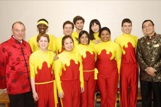 金龙破晓,蛇舞九州。2时整,一条金色巨龙跃上舞台,一时飞上云霄,一时跃入深潭潜渊,左右起伏,上下翻腾,或腾跃、或滚动,或盘起、或穿插.......全场嘉宾们屏息观赏。突然音乐一变,欢乐的中国民乐变成了悠扬的美国影片“泰坦尼特号”的主旋律,舞龙用龙头龙身搭起了“泰坦尼特号”的经典爱情姿势,全场掌声雷动,成功地拉开整场演出的序幕。布莱恩特大学舞龙队是全美唯一的大学生舞龙队,也是一支非常国际化的队伍,队员们来自美国、厄瓜多尔、印度、法国和中国等九个不同国家和地区的布大学生,代表布大孔院多次参加社区表演,并在2012年孔子学院网络春晚节目评选活动中获得“团体奖”的荣誉。