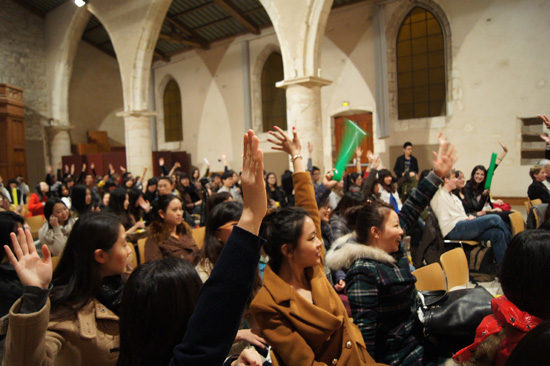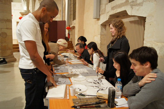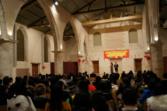 2月12日大年初三的下午,孔院老师和志愿者们早早地来到礼堂,忙碌着贴福字、挂条幅、系中国结、布置演出场地等等,一些中国留学生和法国学生也自告奋勇地前来帮忙,一派喜庆。晚上六点之后,现场渐渐热闹起来,人声鼎沸,触耳皆是喜气洋洋的吉祥话儿,不但学过汉语的法国人会对我们说“新年好”、“蛇年大吉”,不会说汉语的人们也在这种气氛的渲染下,兴奋地学习着用汉语表达新年祝福。