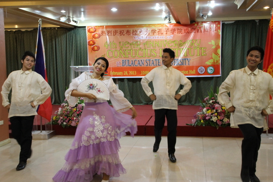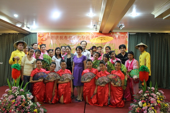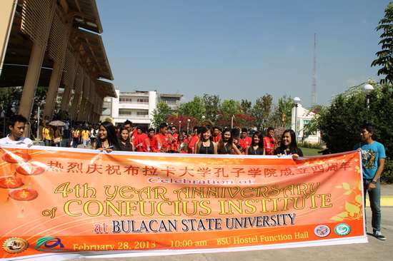 上午10点,由布拉卡大学学生鼓乐队带领,孔子学院的学生在校园中首先举行了盛装游行,庆祝布拉卡孔院成立四周年。随后,学生们来到布拉卡大学宾馆多功能厅就坐,庆典仪式正式开始。布拉卡国立大学副校长兼孔院菲方院长Dr. Cecilia A. Geronimo做了主题发言。她向来宾介绍了布拉卡孔院成立四周年来的各项教学活动以及文化推广活动,尤其是对布拉卡孔院在2012年的HSK考试中取得的重大成绩给予了赞扬,并鼓励布拉卡大学师生继续学习汉语,提高汉语水平,取得更高的成就。布拉卡大学副校长Dr. Danilo S. Hilario也在庆典中致辞,他回忆了布拉卡孔院的成立过程并对孔院在布拉卡省以及周边城市推广汉语做出的努力表示了赞赏。