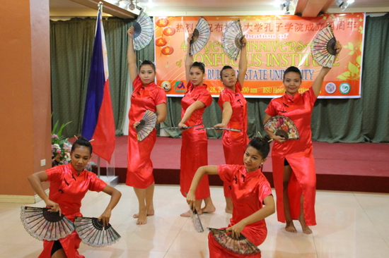 随后,布拉卡孔院的学生向各位来宾展示了精彩的文艺节目。来自布拉卡大学Bustos校区的学生给大家表演了中国舞蹈《恭喜发财》、《小夜曲》,学生们身着旗袍与汉服,舞姿优美富有韵律,赢得了大家的热烈掌声。随后,布拉卡大学合唱团演唱了中文歌曲《朋友听》、菲律宾歌曲《Over Drive》以及英文歌曲《Heal the World》,他们的歌声满溢情感,听者动容。最后,布拉卡大学舞蹈队给观众带来了菲律宾民族组舞,极富异域风情。学生们的表演融合了中菲两国的民族特色,展示了两国的文化风貌,使在场的观众耳目一新。