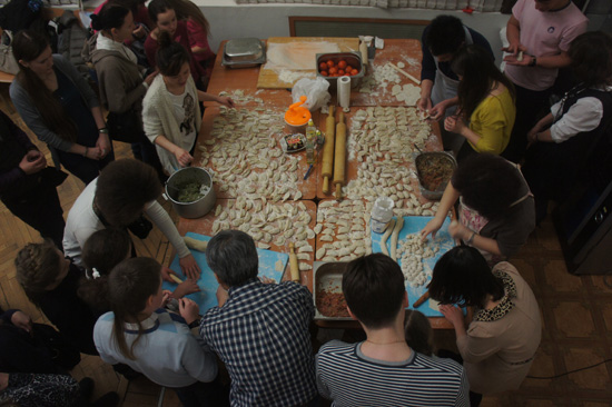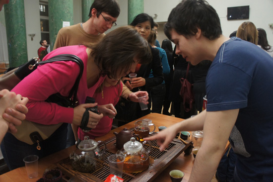 制作中国春节的美味佳肴、观看中国茶艺表演也是迎春晚会必不可少的内容。在孔子学院中方老师的带动下,大家亲自动手,洗菜、搅馅、和面、包饺子、抻面条、做汤圆……,中国特色的饮食文化吸引了大批的学生和市民前来观摩学习。大家在品尝了中国北方的饺子、南方的汤圆和西部的新疆拉面之后仍感意犹未尽,围坐在茶艺角周围,品着中国茗茶,畅谈着对中国传统文化的感受和交流学习汉语的收获。